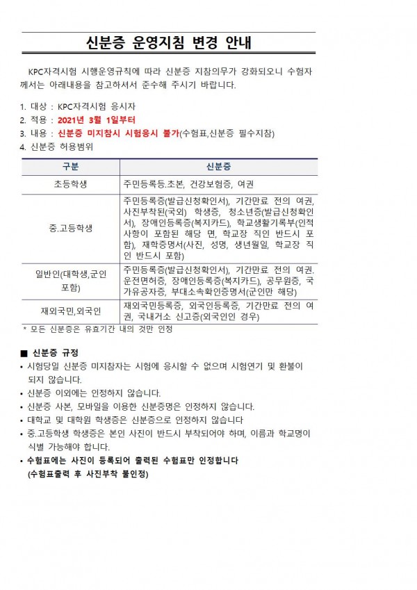KPC자격시험 신분증 운영 지침 변경안 페이지 정보 작성자 한교정 작성일21-01-11 10:28 조회4,255회 댓글0건 관련링크 https://license.kpc.or.kr/nasec/cmm/board/kpcBoard.do?bbsId=BBSMSTR_00… 1086회 연결 이전글 다음글 목록 본문 , 댓글목록 등록된 댓글이 없습니다. 이전글 다음글 목록