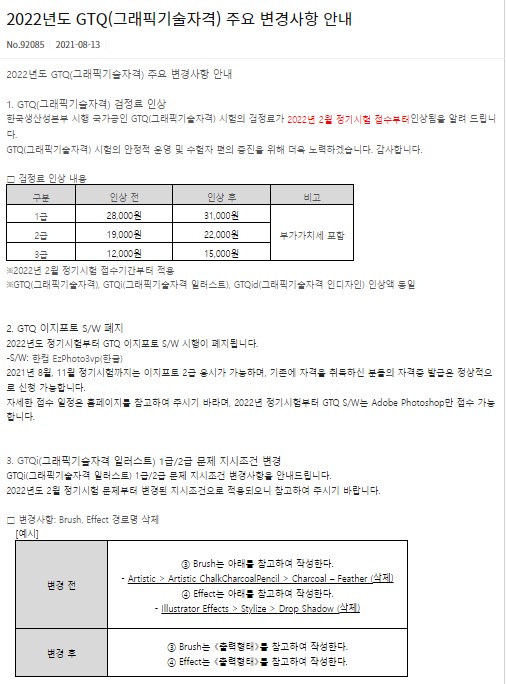 2022년도 GTQ(그래픽기술자격) 주요 변경사항 안내 페이지 정보 작성자 한교정 작성일22-01-12 09:26 조회1,835회 댓글0건 관련링크 https://license.kpc.or.kr/nasec/cmm/board/kpcBoard.do?bbsId=BBSMSTR_00… 441회 연결 이전글 다음글 목록 본문 2022년도 GTQ(그래픽기술자격) 주요 변경사항 안내 댓글목록 등록된 댓글이 없습니다. 이전글 다음글 목록