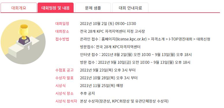 접수방법온라인 접수 : 홈페이지(license.kpc.or.kr) > 자격소개 > i-TOP경진대회 >