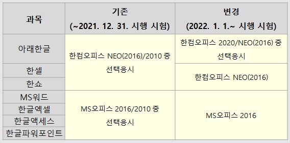 2022년 정보기술자격(ITQ)시험 소프트웨어 버전 안내